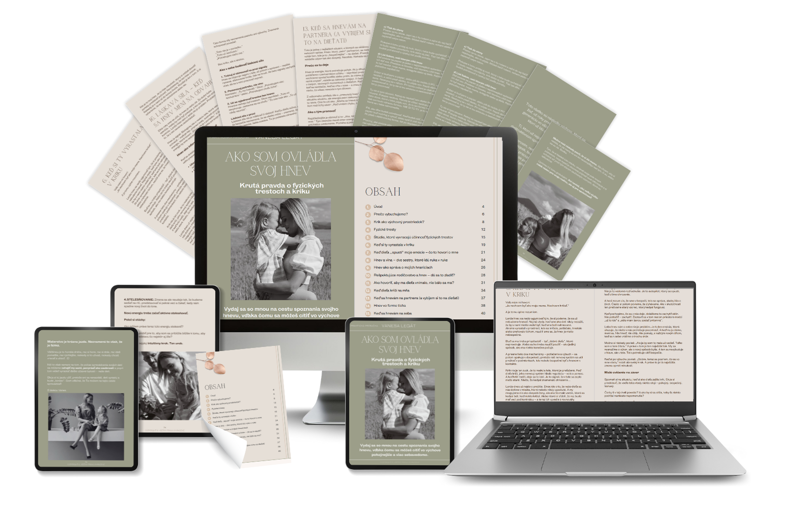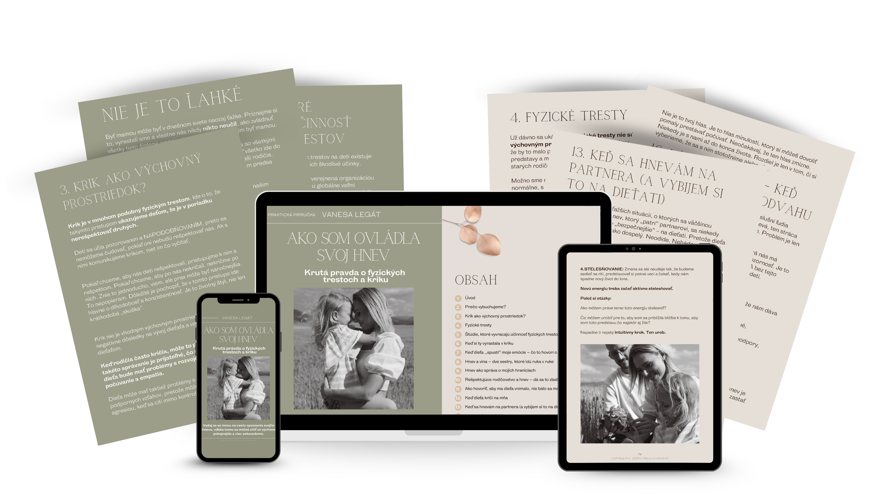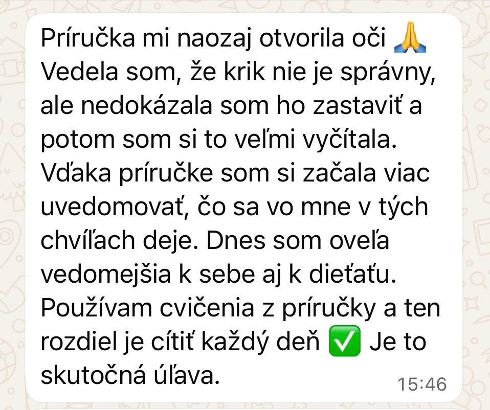 Príručka je dlhší, 79 stranový materiál, kde do hĺbky rozoberám hlavne tému hnevu, kriku, fyzických trestov a toho, aký následok môže mať toto všetko na dieťa.