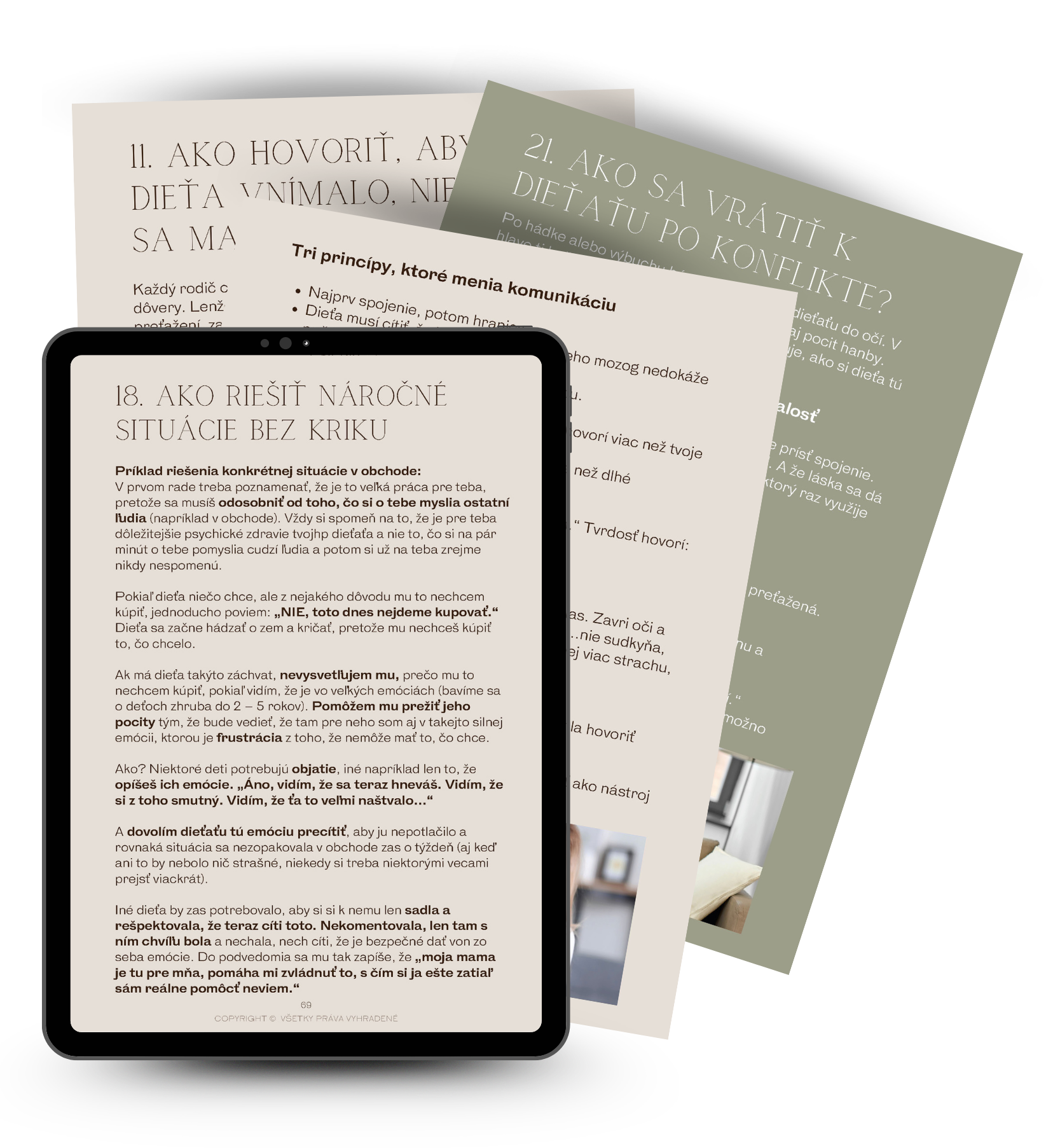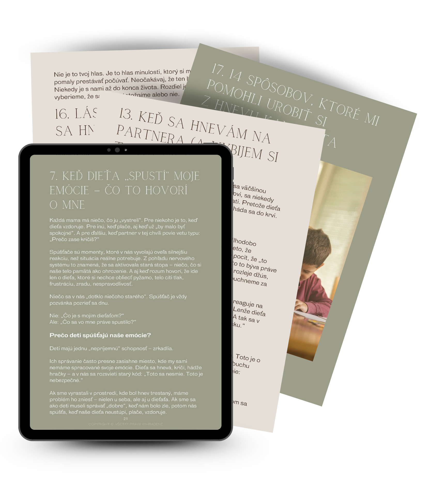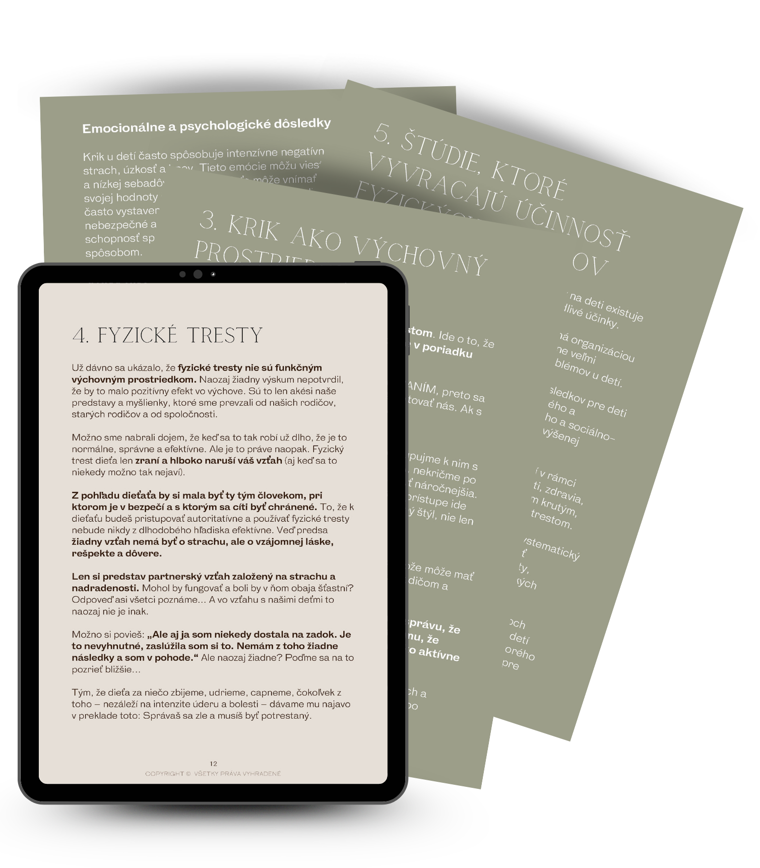 Príručka je dlhší, 79 stranový materiál, kde do hĺbky rozoberám hlavne tému hnevu, kriku, fyzických trestov a toho, aký následok môže mať toto všetko na dieťa.