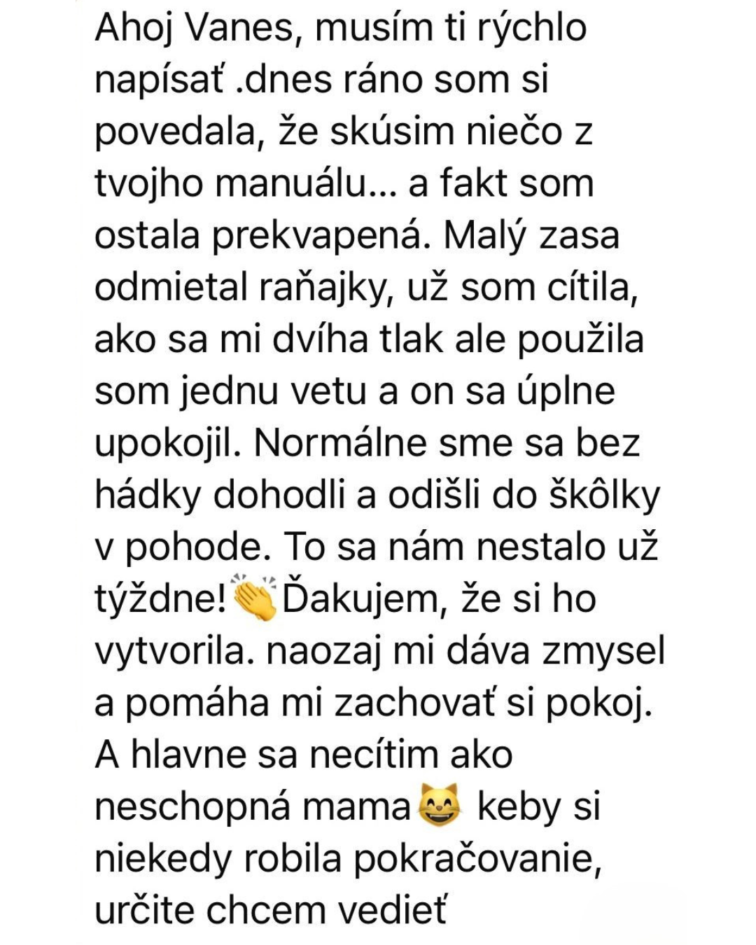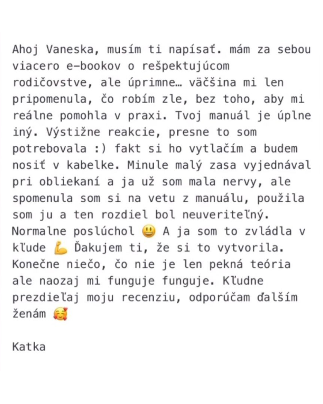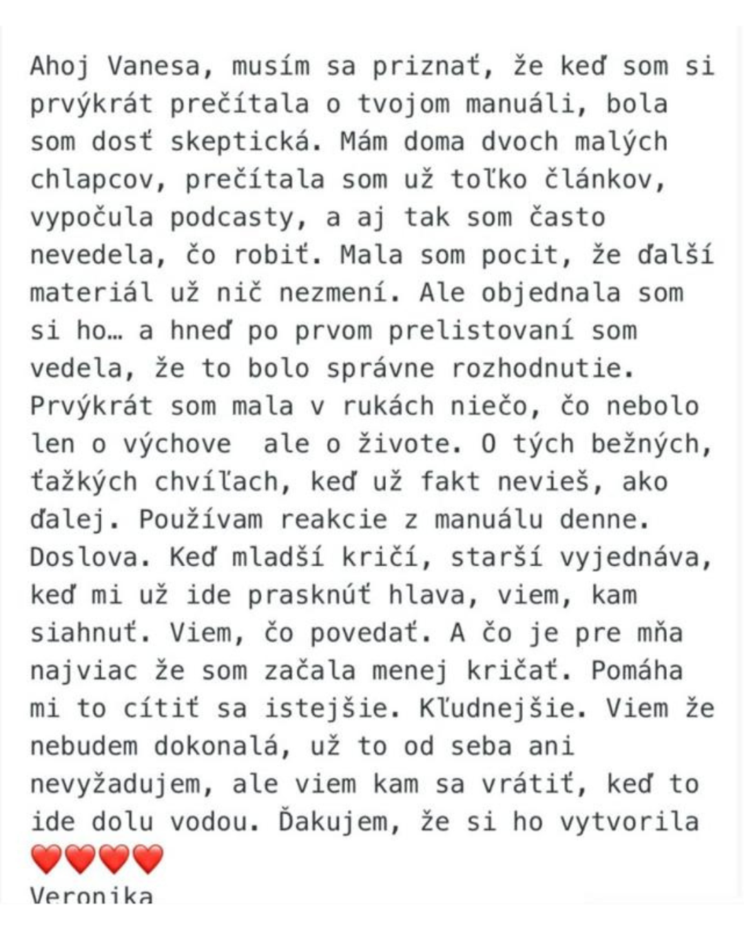 „Vanesko, děkuju za Rodičovský manuál! Vždy jsem se snažila o respektující výchovu, ale jak dcera (6 let) rostla, bylo to čím dál náročnější. Když byla menší, šlo se domluvit, ale poslední dobou se vztekala, hádala, bouchala dveřmi.